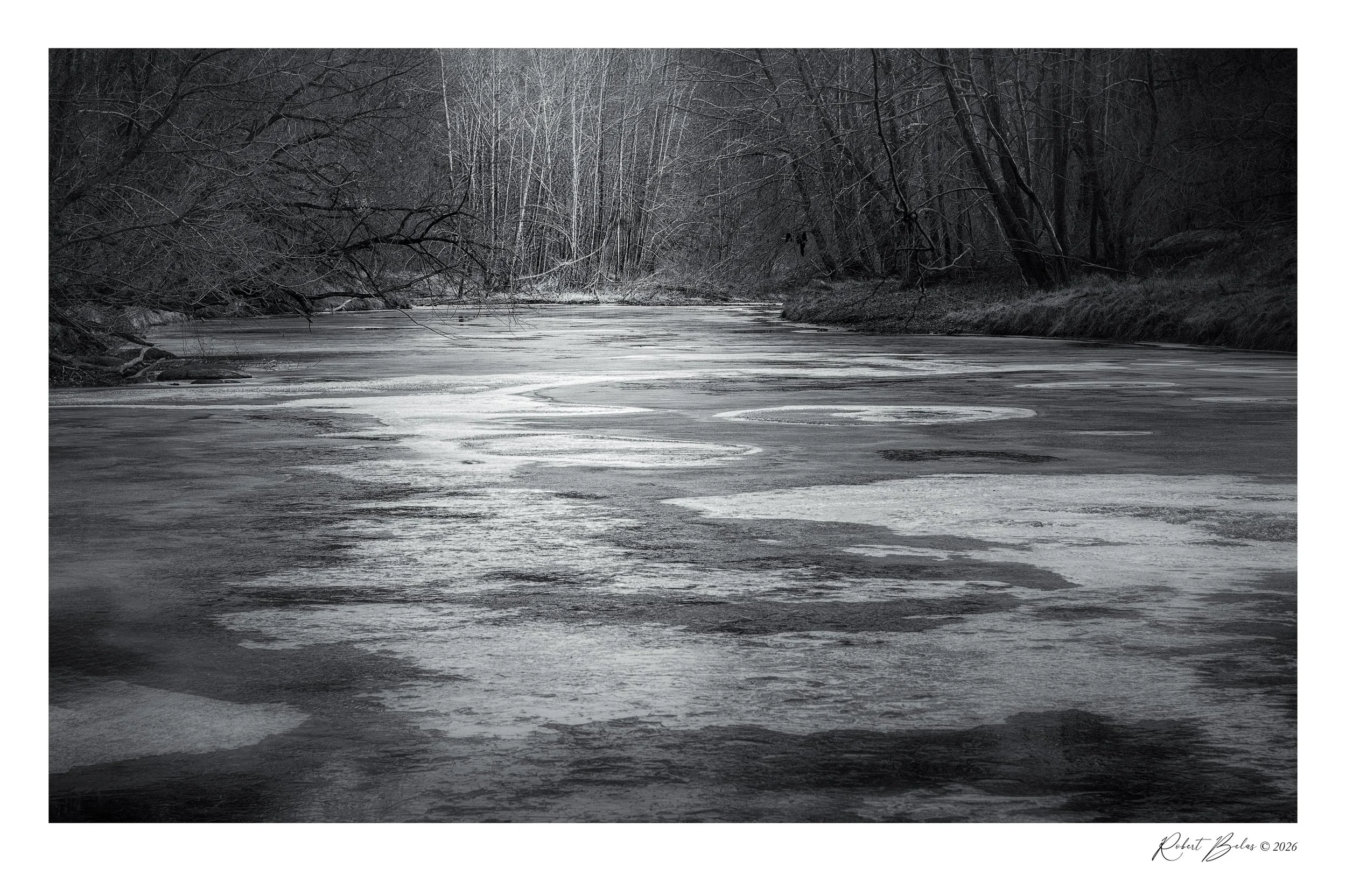 The ice-bound Patapsco River near the Alberton Trail in Baltimore County, Maryland.